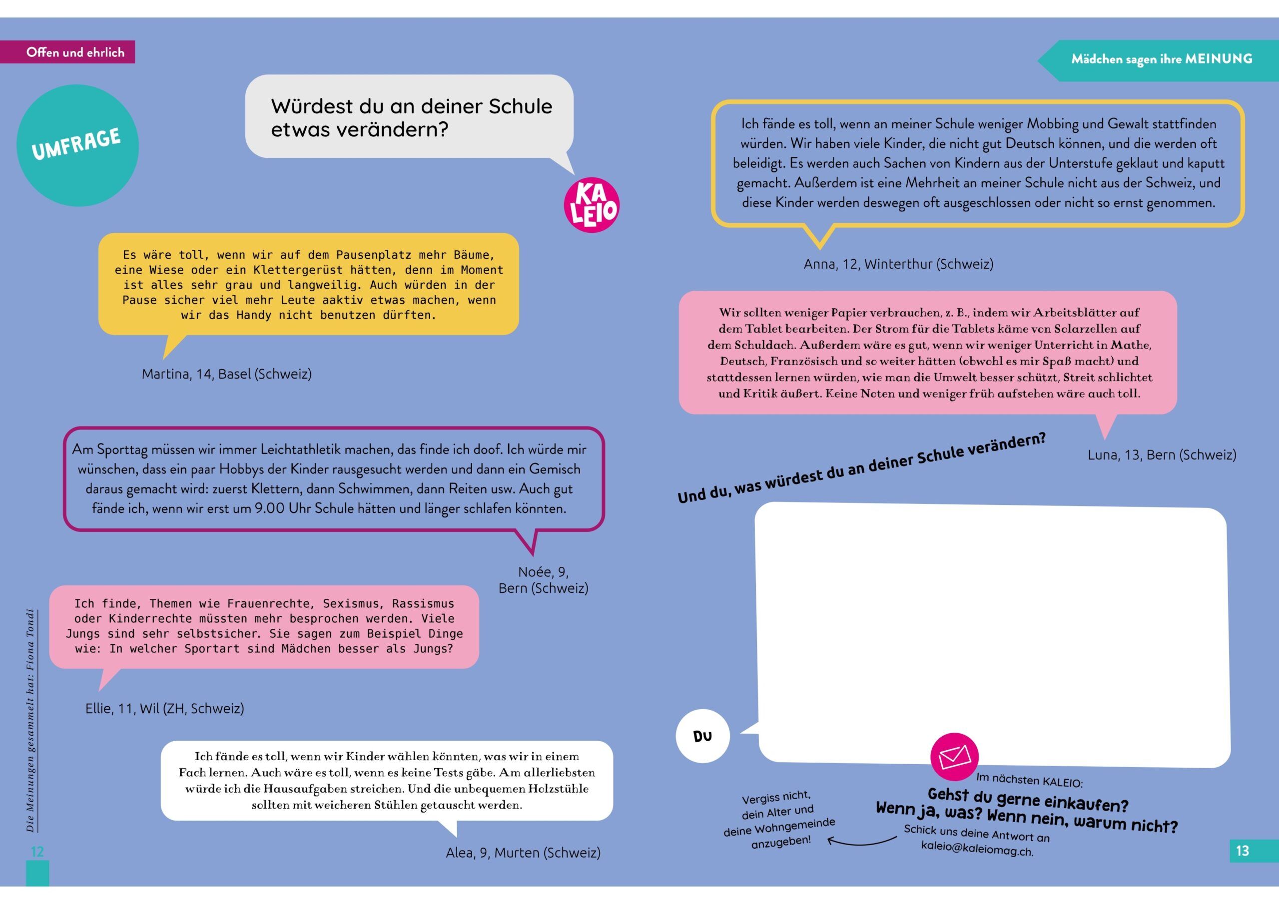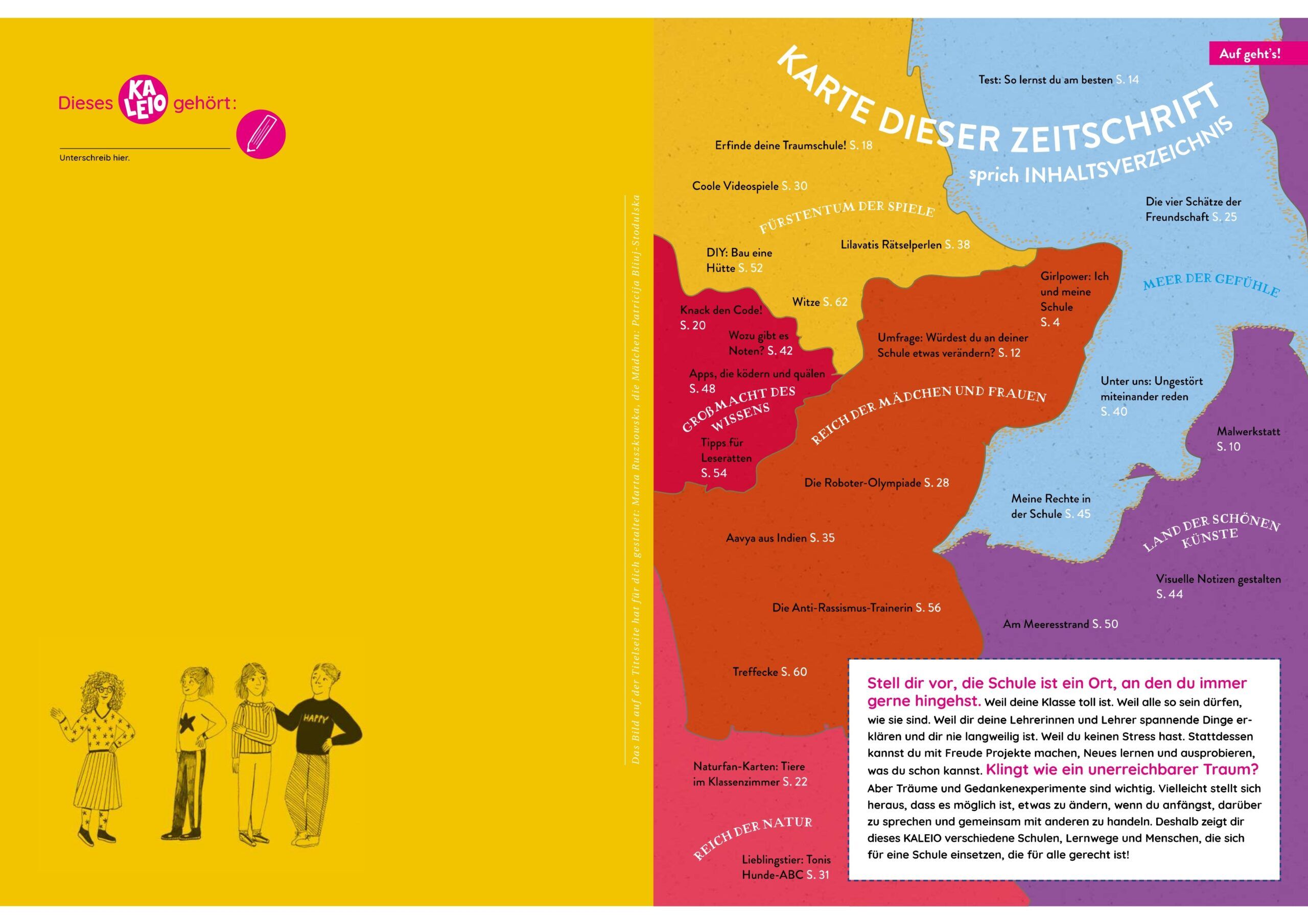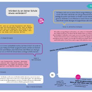 Die KALEIO Nr. 29 «Meine Traumschule» lädt dich dazu ein, über deine ganz persönliche Wunschschule nachzudenken. Du entdeckst, wie Freundschaft, Zusammenhalt und Respekt das Lernen leichter machen, erfährst, wie man mit Stress und sozialen Medien umgehen kann, und lernst inspirierende Frauen kennen, die sich für eine gerechtere Schule einsetzen. Mit vielen Tipps, Ideen und Geschichten zeigt dir diese Ausgabe, wie Schule ein Ort wird, an dem du selbstbewusst wachsen kannst.