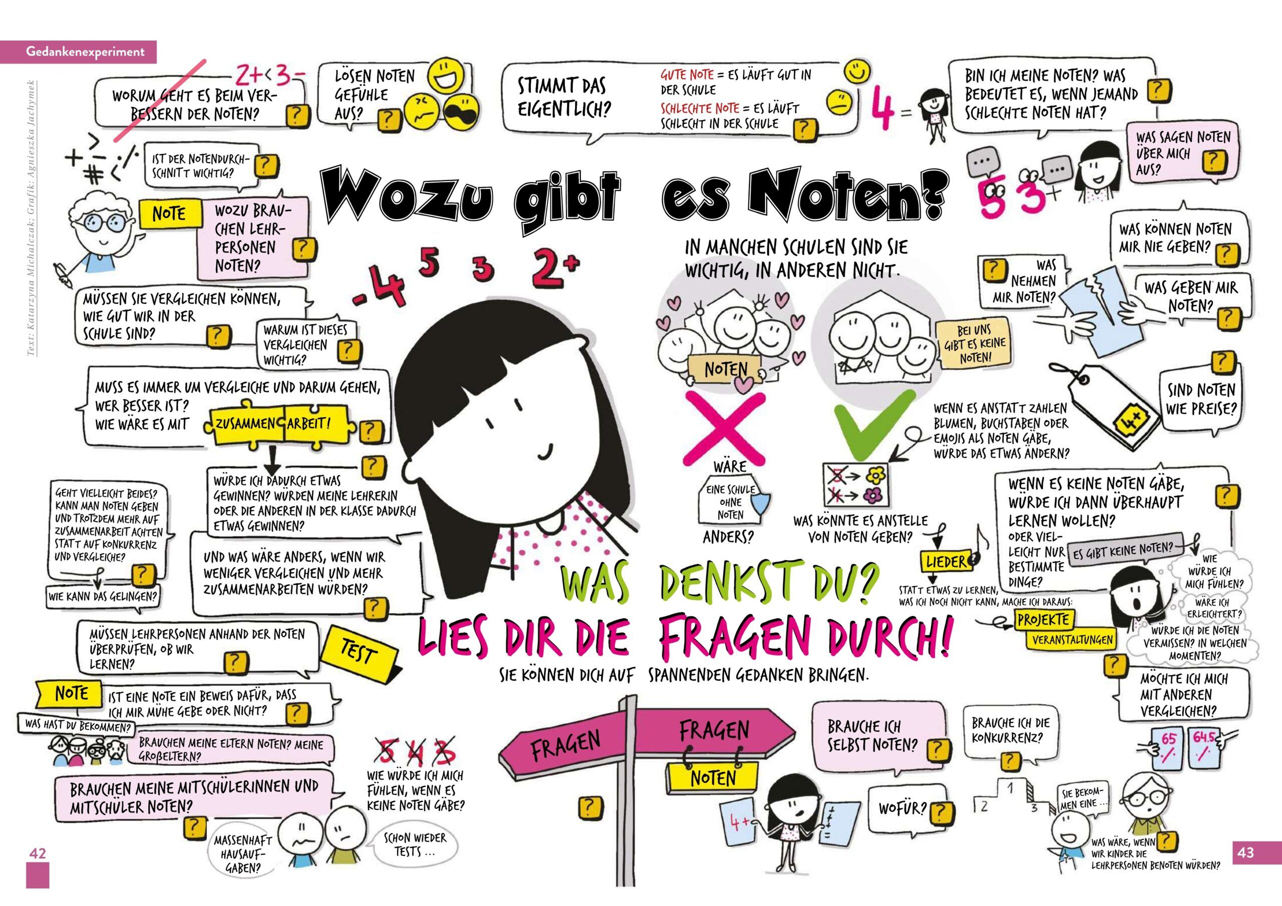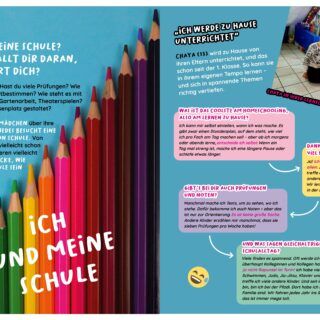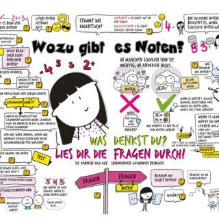 Die Schule ist ein Ort, an dem Kinder viel Zeit verbringen – manchmal voller Freude, manchmal voller Frust und Fragen. Was macht eine Schule zu einem Ort, an dem wir gerne lernen? Was brauche ich, damit ich mich wohlfühle? Und wozu sind Noten eigentlich gut?
